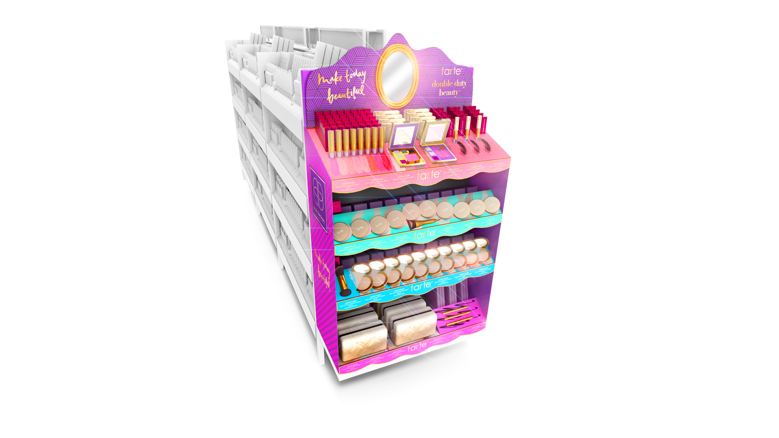 ENDCAP FOR TARTE BRAND FOR ULTA STORES. COLD ROLL STEEL CONSTRUCTION WITH MAGNETIC GRAPHIC AND VACFORMED PLASTIC MERCHANDISERS.
